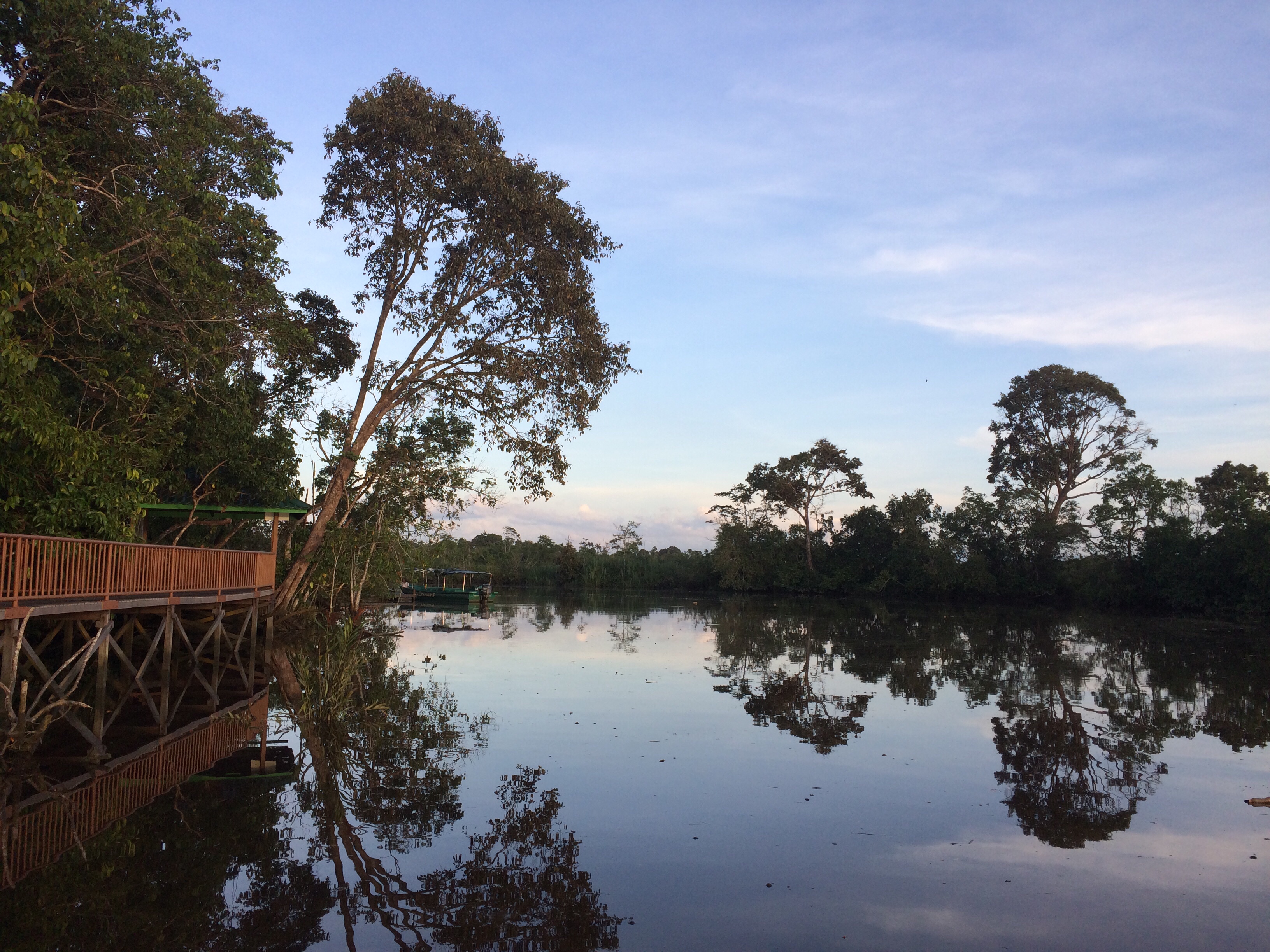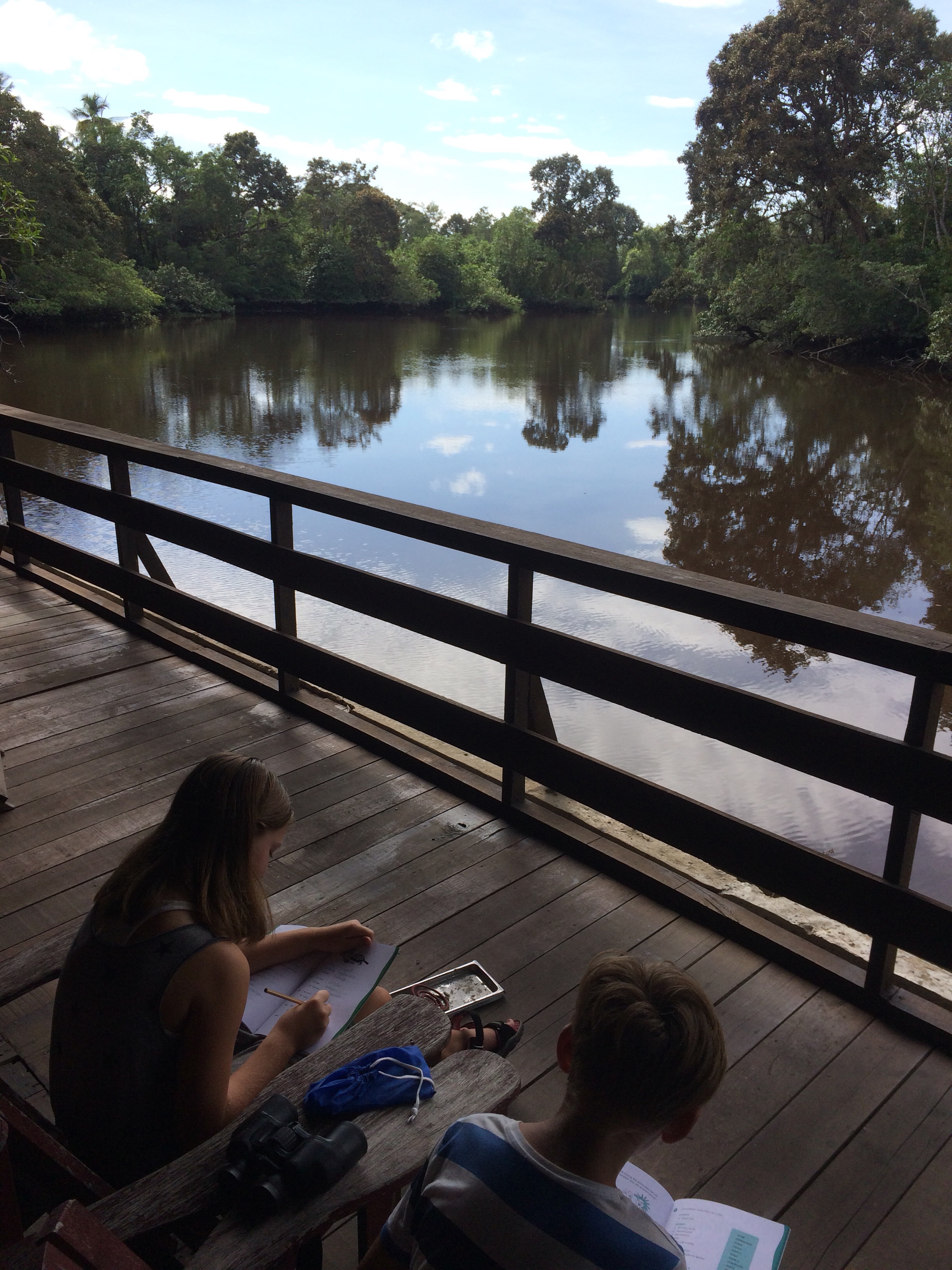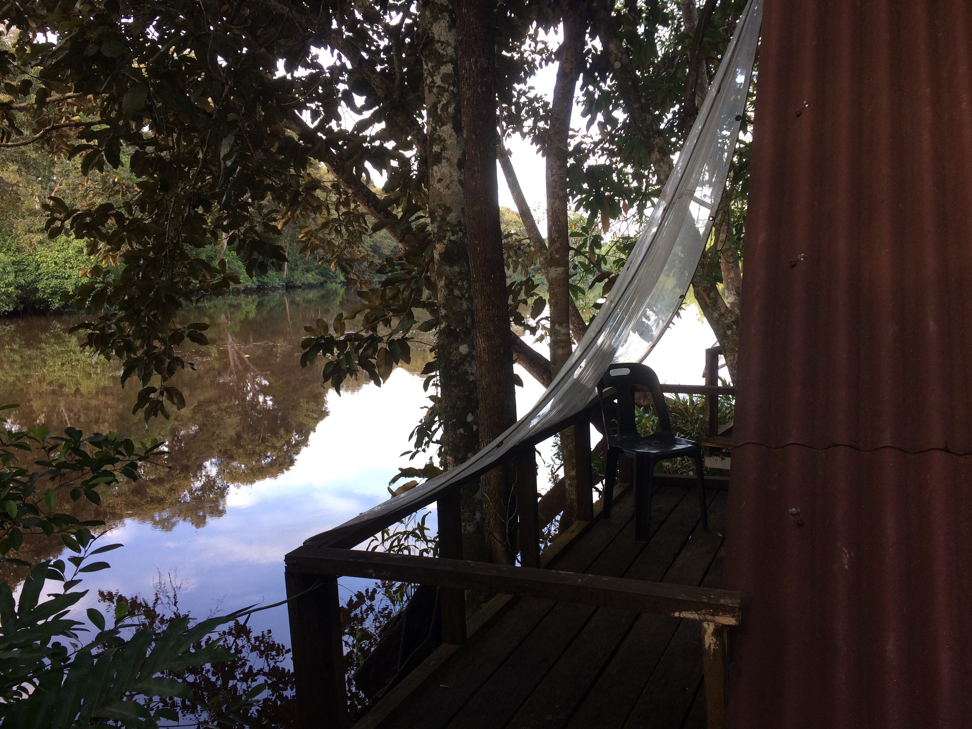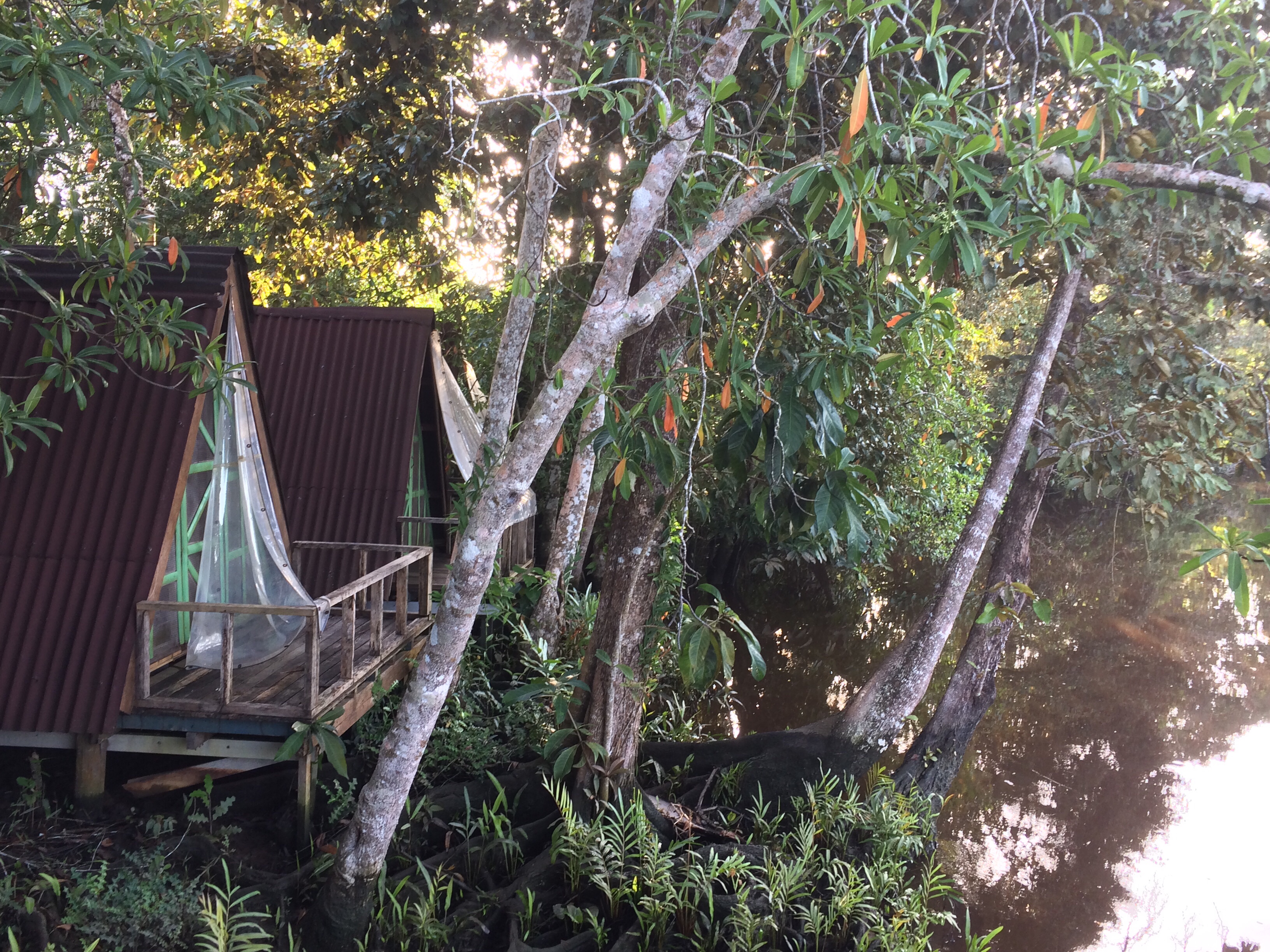 Vid Klias river sov vi i tält i två nätter i våtmarkerna. Tälten är byggda på pålar en halvmeter ovanför sumpmarken. Gissa om vi hade sällskap av en massa insekter! Första natten fick Tuva och jag byta tält eftersom vårt tält invaderats av trämyror. Vi låg på en madrass direkt på marken och sov i sovsäckar. Det var varmt, fuktigt och myggigt – väldigt myggigt! Det blev ingen sömn alls för oss vuxna dessa nätter. Så fort morgonen kom glömde man dock bort nattens besvär för då kunde vi sitta och äta vår frukost med utsikt över floden och samtidigt se tre olika sorters apor i träden runt omkring (näsapor, makaker och silver leaf monkeys) samt näshornsfåglar, örnar och ödlor.