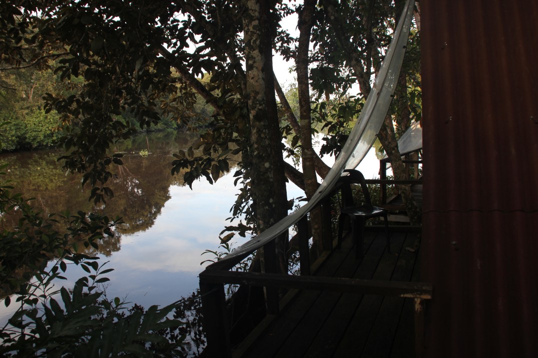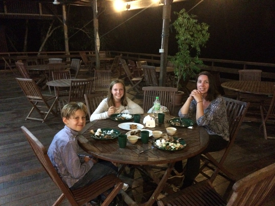 Naturligtvis en helt magisk plats att äta sin frukost på, att göra sina läxor på och att bara vara på MEN så fruktansvärt obekvämt att sova i tält. Eftersom det regnar så gott som varje dag så var det plåttak uppsatta över tälten. Detta gjorde att temperaturen i tältet var på bastunivå. Bastukänslan förhöjdes av fuktigheten. Vi sov på madrasser direkt på tältgolvet och lukten av dessa fuktiga madrasser är obeskrivlig. Redan första natten fick Tuva och jag byta tält eftersom en hel koloni myror valt att flytta in i vårt tält. Därutöver delade vi tält med spindlar, tusenfotingar, skalbaggar och myggor. För att ”skydda oss” låg vi väl förpackade i sovsäckarna och med handdukar runt huvudena. Vilken syn!