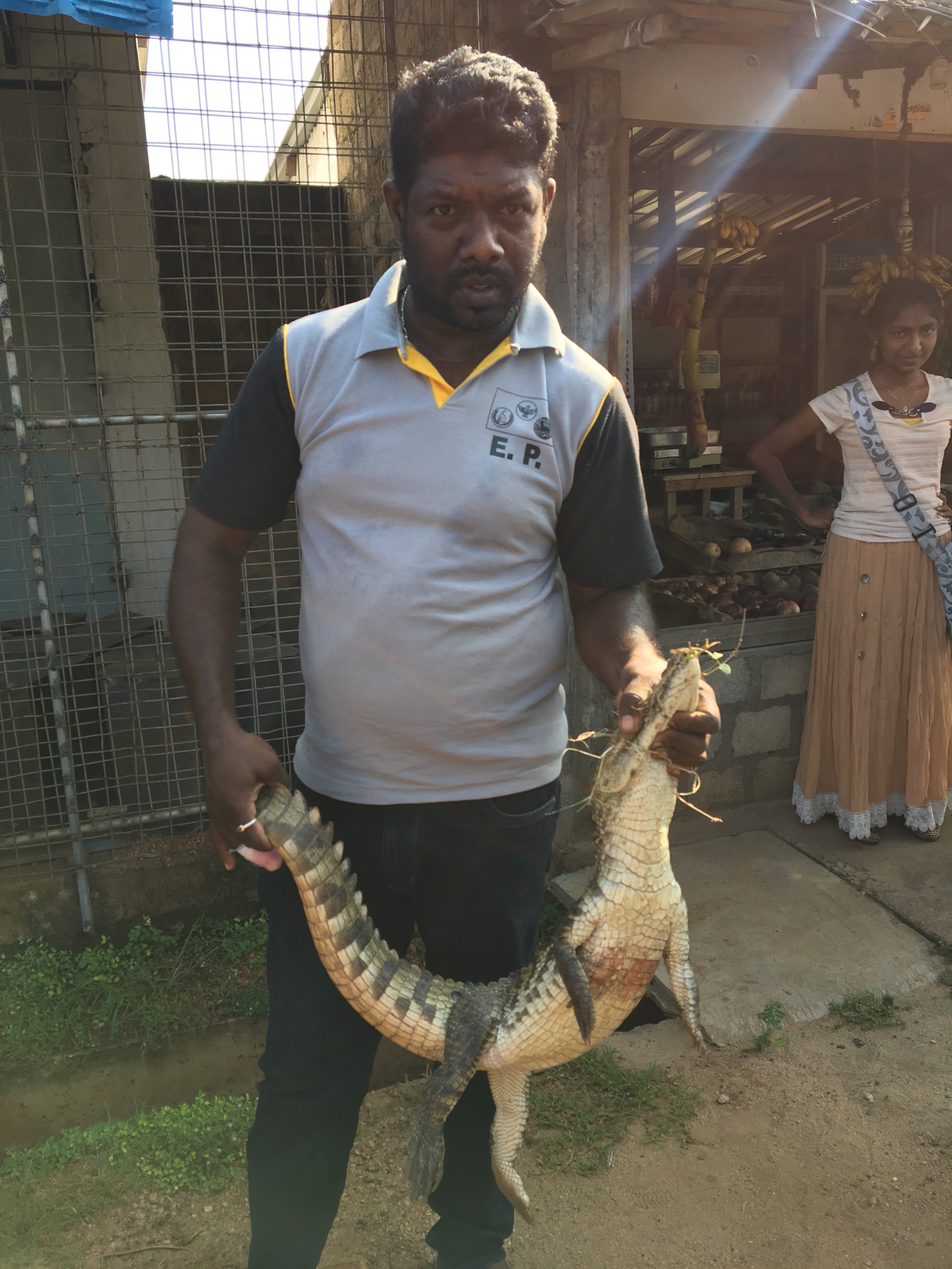När vi tog vår morgonpromenad till stranden så såg vi en grupp människor som verkade uppspelta. Vi gick dit för att se vad som hade hänt. Då såg vi en man som höll i en krokodil.