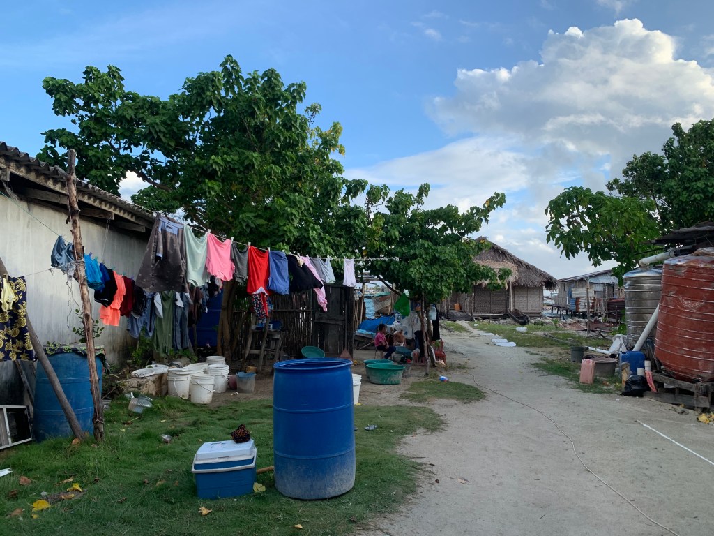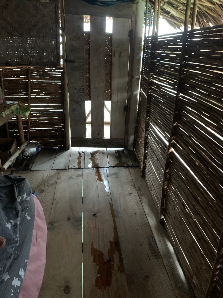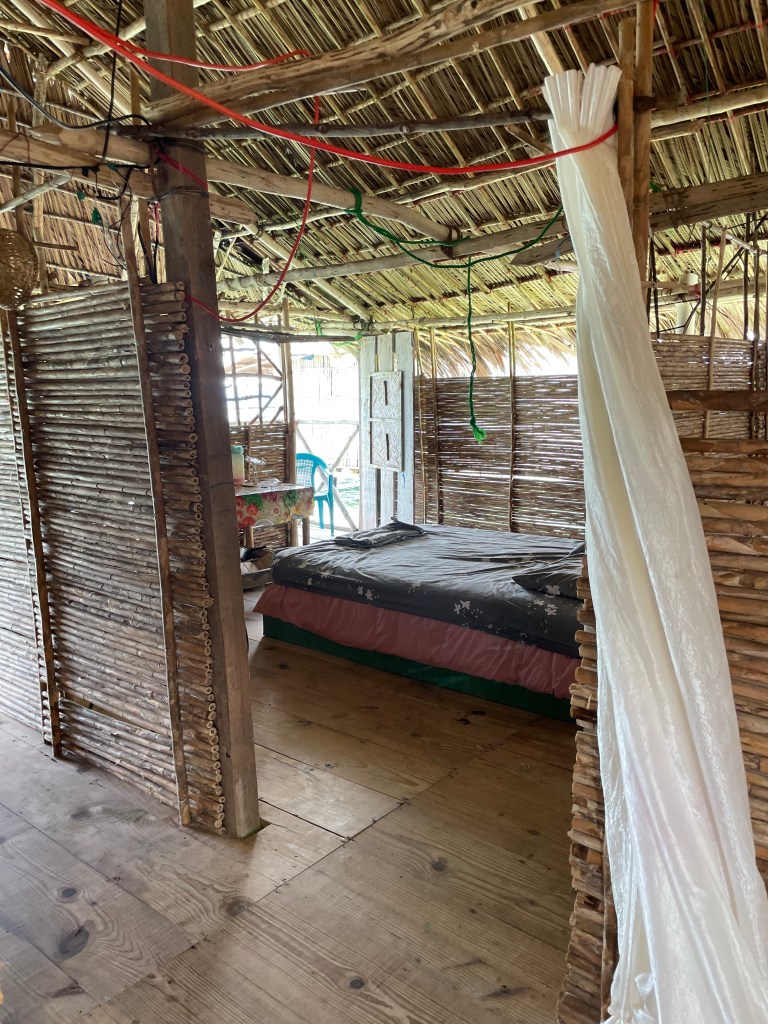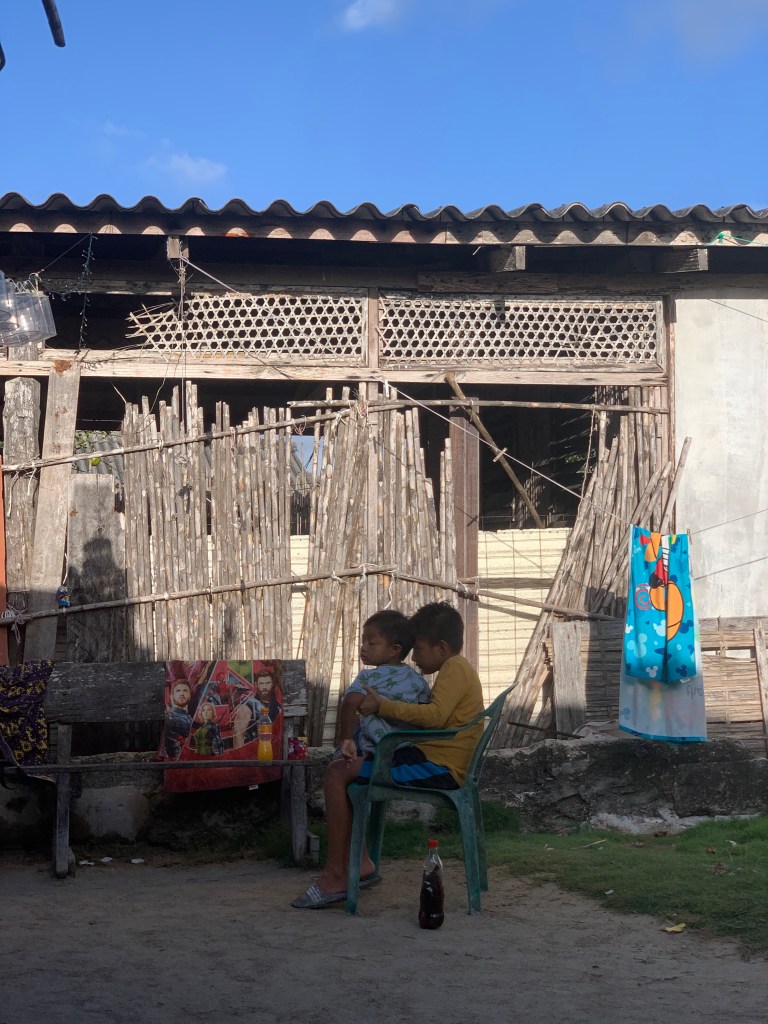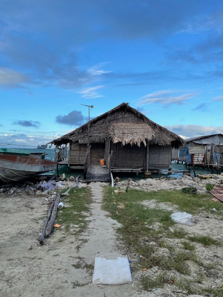 Vi kände oss en aning i vägen i sörjandet och förberedelserna. Vi tog promenader på ön som bestod av endast 35 familjer och passade på att vila i vårt nya boende. Vårt nya boende var ett luftigt hus på pålar vid stranden av ön. Väggarna bestod av grova vassrör och vågorna slog upp mellan golvplankorna. På nätterna var det storm och regn och då regnade det in genom väggarna och vi fick hålla i täckena för att de inte skulle flyga bort!