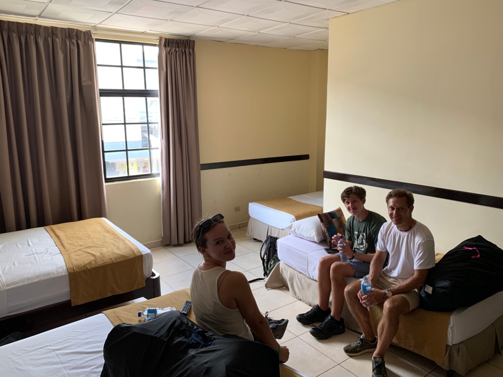Vårt boende i David. Lyxigt med fyra sängar! Det är vi inte bortskämda med! Och ljust golv så att man ser eventuella småkryp. Och rena sängkläder. Det är inte svårt att göra oss nöjda… På bilden syns också de packpåsar som vi använder till våra ryggsäckar vid bussresor och flyg. De är så praktiska och skyddar mot smuts och gör dem lättare att stapla på varandra.